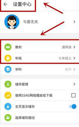 1、首先在“设置中心”选择适合自己的“教材”和“年级”。