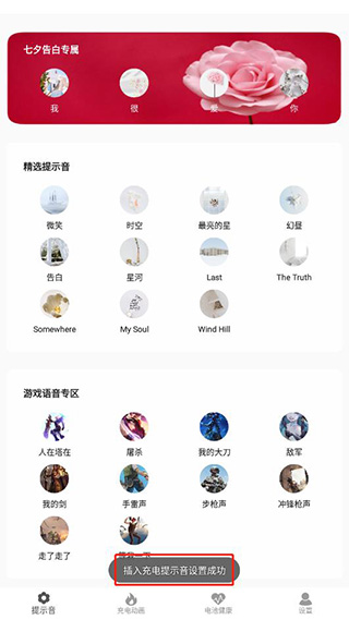 3、可自由选择充电、充满、拔出等充电场景进行提示音或者动画的设置。