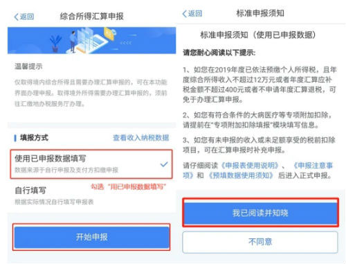 2、进入申报界面,选择【使用已申报数据填写】,阅读申报须知点击“我已阅读并知晓”。