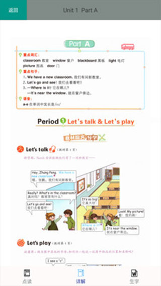 3、高清的全彩电子课本,电子书:可点读、连读;页面上的“所有英文”均配有中文翻译;