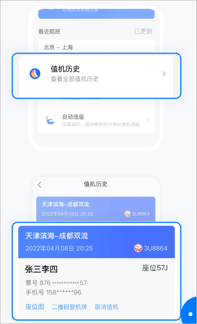 6、值机成功后,返回【值机选座】首页,点击值机历史,查看二维码登机牌,或取消值机。