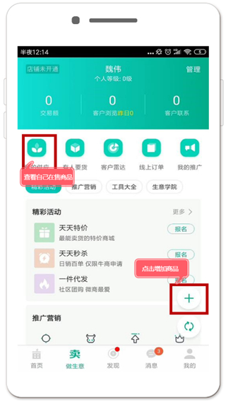 通过实人认证后,“0元开店”变为“做生意”,标志着店铺的成功建立。您可以在此界面管理店铺运营,如查看在售商品、客户报价,以及进行店铺推广等。