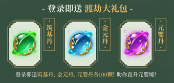 首发7天内,只要登陆游戏,即可免费领取渡劫大礼包一份,内含从筑基、金丹到元婴的大量渡劫丹药,助你100%几率轻松度过雷劫,轻松登顶元婴境界!