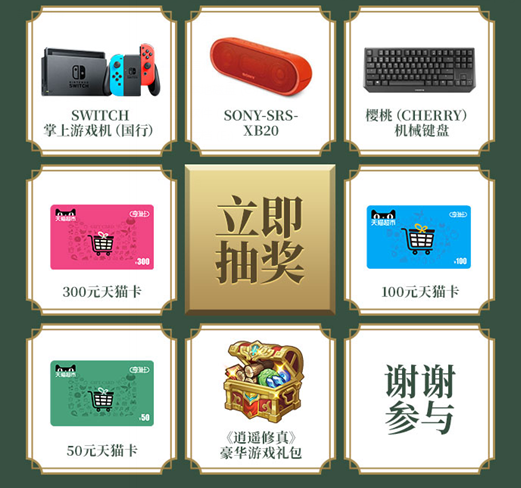 在首发7天内,下载并登陆游戏。即有机会抽取Switch、樱桃机械键盘、SONY-SRS-XB20音箱等实物壕礼,数量有限,先到先得,送完即止。