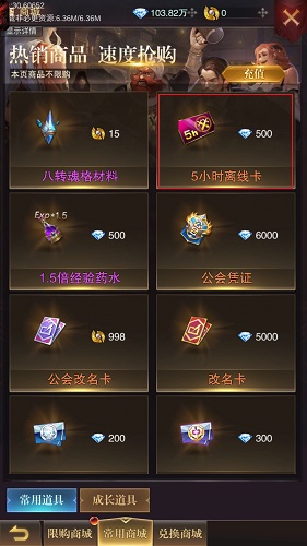 玩家使用离线卡即可激活离线挂机功能,在下线后角色还能获得打怪收益(经验、道具)。每一张离线卡提供5小时离线挂机时间,最多可累积20小时离线挂机时间。玩家可从商城和公会每日奖励获得离线卡。