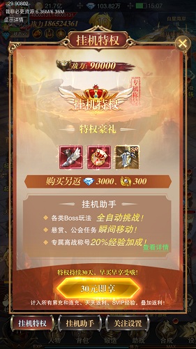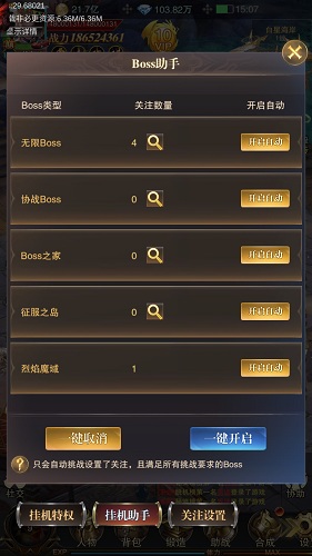这里特别说明一下挂机特权!玩家开通挂机特权可20%经验加成;悬赏公会任务瞬间移动;无限BOSS、协战BOSS、BOSS之家、征服之岛、烈焰魔域都可以自动挑战。不仅如此,玩家还可以设置关注BOSS,提高刷怪效率!