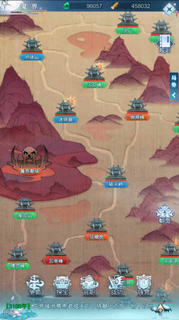 仙、妖、魔三方势力在地图上角逐,占据领地,获得更多资源。玩家点击确定目的地,系统会计算最优路线,一路攻打、挑战到目的地。天魔入侵时,据点会标记为红色,表示此处有天魔。天魔每过一段时间就会随机出现在各个据点,扰乱玩家的进攻路线。