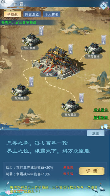每周六开启三界争霸战,当天向所有阵营玩家开放争霸加成。