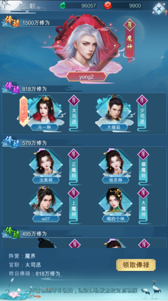 官职设有13个,玩家占据官职后可以获得大量修为加成,每日能领取官职加成的俸禄。同时,该职位可以被其他玩家挑战,击败当前职位玩家,则可占据当前官职。