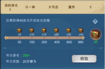 攻打天魔会获得战功。积累战功,可以开启战功宝箱,且每日能领取战功排名的修为奖励。