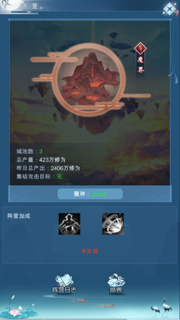 玩家可在阵营界面内进行换界操作,每天都能更换一次阵营(仙、魔、人),在24小时之内不可再次更换。更换后,所有的职位和战功都会清除。
