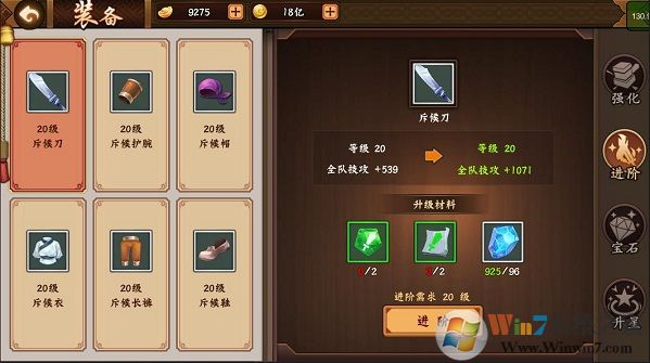 装备的进阶可以给装备获得更高的强化空间。进阶需要消耗装备原石和装备图纸,以及进阶石三种游戏资源。三种资源都是通过通关普通征战副本获得,需要注意的是,原石和图纸需要通关特定副本,而进阶石则是所有普通副本都会掉落。