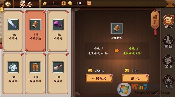 点击“强化”按钮,会强化装备1级;点击“一键强化”按钮,会直接将装备强化到可能的最高等级,直到金币不够或者装备强化到顶。