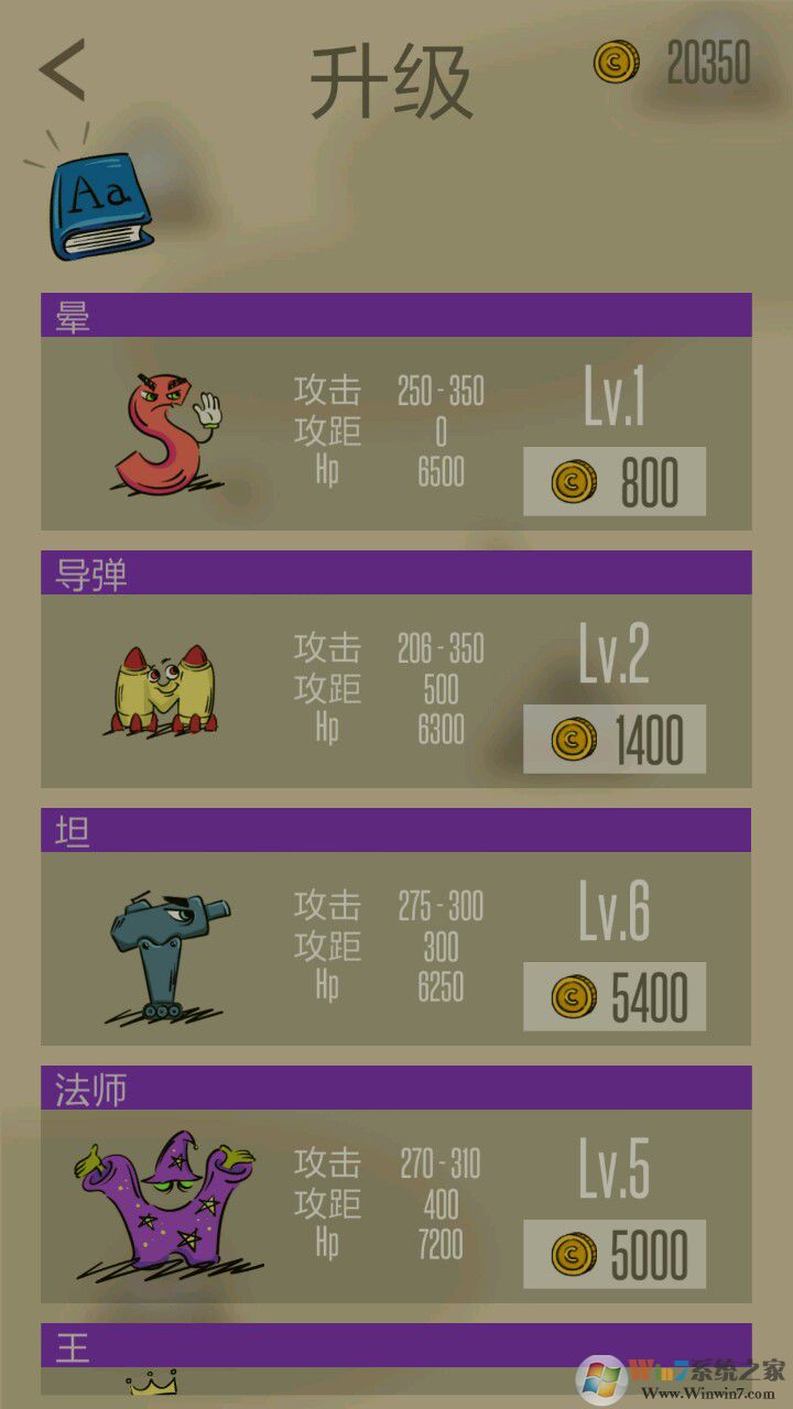 1.一开始进游戏只有一个兵种其实就是A,这都是快穿炮灰小兵,靠数目制胜,在杀怪时关键导出或是独特兵种,特别是范围攻击的。但是在打较难打得说话不清楚的时候我们主要依靠这种小兵的总数优点,升至100+跟其他升满之后打说话不清楚应当问题也不大了。2.独特兵种中,我是觉得最好用的是T(坦)和H(法师),这俩是范围攻击,应对微信大群低等怪物时,可能免伤战胜她们,赚金币极快。还有一个就不得不说的便是字典了,这一靠的是本人积淀,每一次游戏时收集右上方英语单词里的英文字母,26个英文字母齐了就能招唤字典(误),字典导出高,覆盖面广,而且还是范围攻击,血较为薄一点。