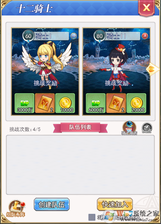 十二骑士挑战不仅是获取主角经验和金币,每天挑战5次。获取骑士之证可以在商店-骑士商店内兑换神装和各种突破道具,是前期除了挂机和组队挑战以外快速获取装备提升主角战斗力的方式之一。