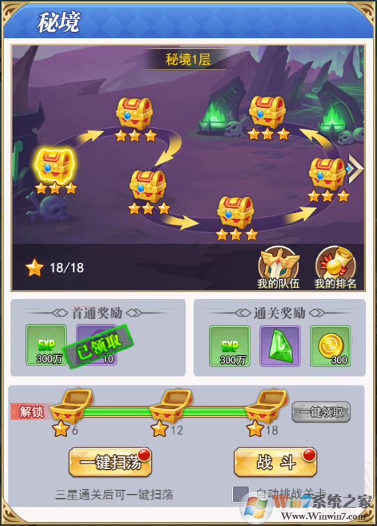挑战秘境可以获得主角经验,提升主角等级外还可以获得宠物洗练石和宠物突破石,通过在秘境获取的资源去培养宠物也能给主角阵容带来战力加成,并且达到全三星通过后还能一键扫荡,是前期获取宠物养成资源兼提升主角等级的玩法。
