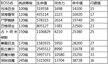 个人boss攻高血厚,挑战他们需要足够的勇气和实力,这里有一份100至250级的BOSS信息表,希望可以给大家一个直观的数据参考。