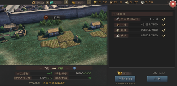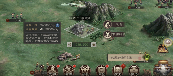 主公们可以在主城中,建造农田、伐木场、采石场、冶炼厂等土地,以此来提高获取资源的效率,增加各类型资源的产量,加快自身势力的发展速度。除此之外,主公们还可以在世界地图中,寻找自己需要的资源土地,通过行军采集的方式获取相应的资源。采集时间越长,资源土地等级越高,获得的资源就越多。主城周边资源越是丰富,主公们成就霸业的速率也会有相应提高!