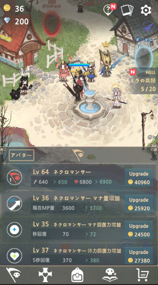 就是那个你一开始游戏手握镰刀的,这四个是用金币来升级的,金币可以通过正常的闯关和打挑战获得。下面还有三个是用钻石来升级的,我便不放图了。而且一定要多升级主角的等级啊啊啊啊啊,就是这张图里红色拿镰刀的图标,一定要多升级,二十级开启商人,三十级开启挑战,而且很多强力随从都是主角到60级以后才能从商人那里刷出来的。