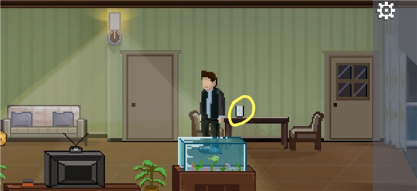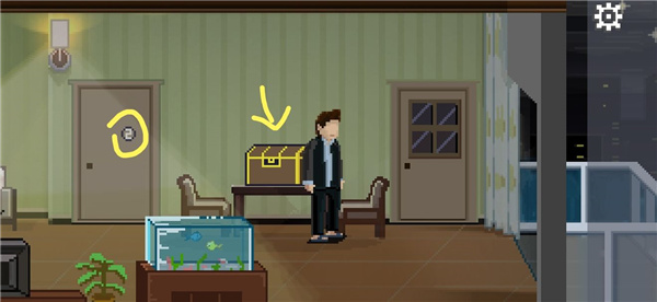 按一下墙上的白色机关,上面有一排按钮,下面有四个提示,按提示把上面四个柜子的把手都转到左边,会掉落钥匙。点击妻子,提示凶手在右边,好的继续往右走。