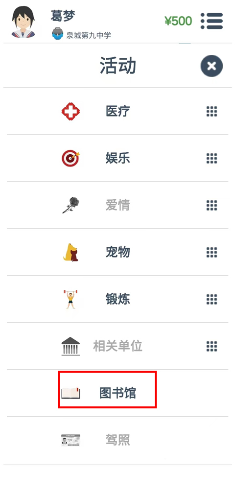 5、然后点击右下角的【活动】,再点击【图书馆】,去图书馆可以提高智商哦~(由于年龄不够,所以一些活动就参加不了)