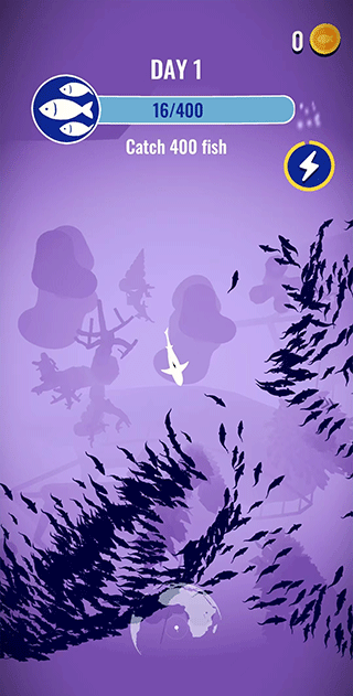 3、游戏的画面很刺激,可以置身于鱼群风暴中央,用不同的方式来捕捉食物。