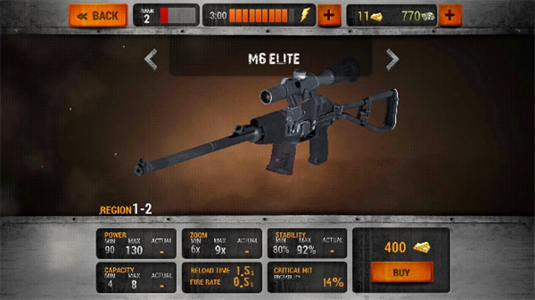 你可以使用几个能量帮助你在战斗中。提高你的目标,停下来的时间,获得额外的能量......如果你想用爆头杀死所有的僵尸,你将需要其中的一些!因为你制作的爆头越多,你赢得的钱就越多!