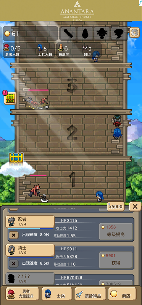 1、我们可以轻松的召唤士兵进行攻击,当然了我们也可以选择直接的进行攻击,玩家必须要升级这些人物才能帮助我们获得高分,这个是非常的关键的,在后面的塔上boss的属性非常高。