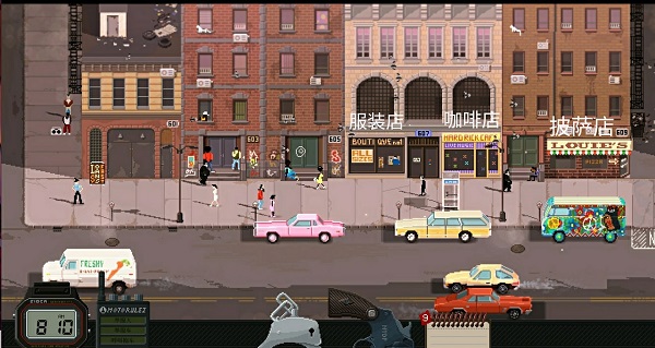 【地图二】(从左到右分别是:披萨店、酒吧、妓院、便利店、热狗摊、汽修厂)