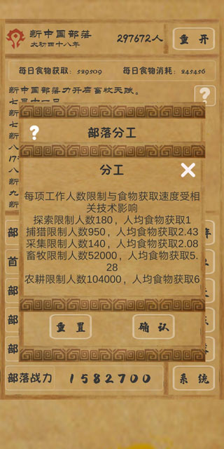 ③生育:高玩可以挑战第三个,我一百三十万的存档就是从这里开始一直暴人口,玩的有点心惊胆战,一般玩家可以点第二个,游刃有余,也不会太累。注意,生育和灭部落才是部落最重要的人口来源,而不是游民。