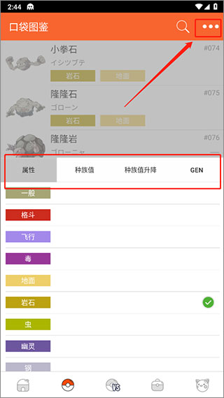 也可以通过点击右上角的三点,根据属性、种族值、种族值升降和GEN来筛选精灵。