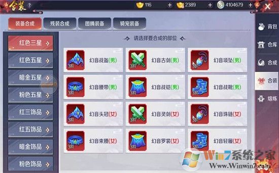 对了,这里一开始很多刚玩的玩家是不知道装备是可以合成的,大家看到上面这个图合成按钮了嘛,一开始最基础的副本里面可以打到红三星装备,然后大家就可以用这些红三星来合成红五星了,三星装备的属性加成是比较少的,比较鸡肋,最好都是优先使用红五星的装备,且一开始3阶装备的合成成功率是百分之一百的。如果大家装备不够的话,建议大家能够进一个排名比较前的公会,活跃人数多一点,进入到人多的公会中,就会有公会仓库,然后很多人用不完和不同性别的装备就会扔到仓库中,这时候就要看手速了哈哈。