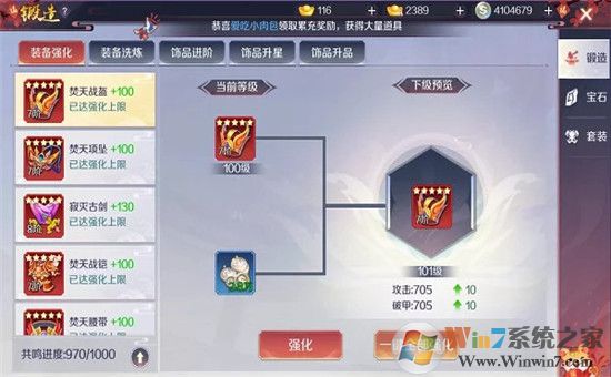 装备系统还有一个比较重要的地方就是炼器系统了,这个也是装备系统的核心,包括了锻造、宝石和套装,这三个加成的战力都非常多。首先装备强化一开始都要强化到最高级,放心这时候银币是够用的。然后装备洗练的话洗练到红色和橙色属性都可以停了,一般橙色的都比较不错了,然后把红色和橙色的锁定下来再继续洗练。再看看宝石镶嵌,宝石的话一开始会有挺多的1级宝石,这个需要自己去点击提升宝石的等级,初期的话提升到4级宝石就很强了,不行可以先用3级宝石顶着用。套装是战力加成最多的地方了,会有分为三个阶段的套装,包括幻灵套装、入圣套装和超神套装,合成越高级的套装,需要的幻灵套装石和入圣套装石比较多。这些套装石可以从轮回幻境、万妖荒域、心魂秘境和国家版图中获得,也有一些限时礼包可以购买,看到有比较高性价比的礼包就可以直接购买哦,这样套装成型就会很快。