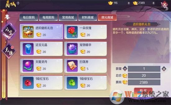 上面讲完了最主要的装备系统,还有就是宠物、坐骑、羽翼、神兵和法宝这些系统啦,这里给大家的提示就是这些系统培养会比较缺进阶石,进阶石每天可以用绑元买到五个随机礼包、还有荣誉兑换也可以换五个,这个每天都要记得领一下。还有就是每周限购拉,每个只需要12元宝,性价比也是比较高的,实在不够的话可以从这里购买。