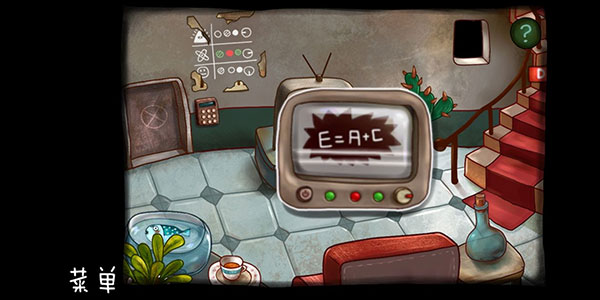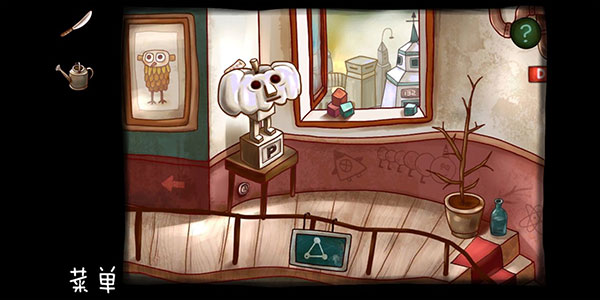 去右边的场景把左下角的电路解开。从这个场景得到水壶,拿着水壶去楼下的鱼缸里打水,再回到这个场景给这个植物浇水,得到苹果给小飞虫吃,得到钥匙把机器人解锁。
