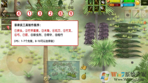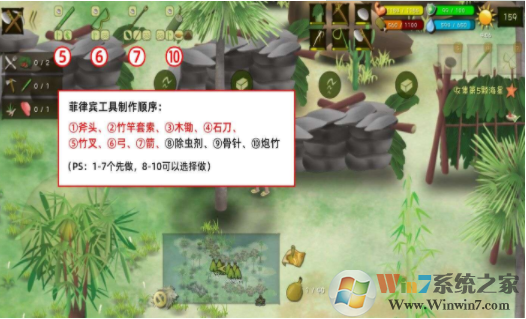 开局制作工具的先后顺序:①斧头、②竹竿套索、③木锄、④石刀、⑤竹叉、⑥弓、⑦箭、⑧除虫剂、⑨骨针、⑩炮竹