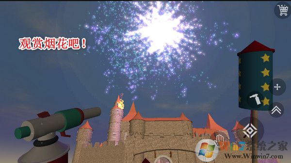 4、进入地图,现在正式开始教大家怎么操作烟花模拟器,屏幕左边是移动,右边的按钮可以捡起烟花、摆放烟花、拿出点火器点火、跳跃,然后就是右上角的烟花商店按钮