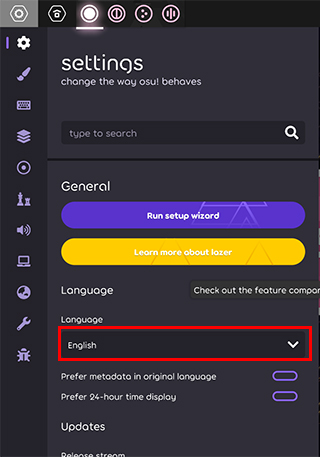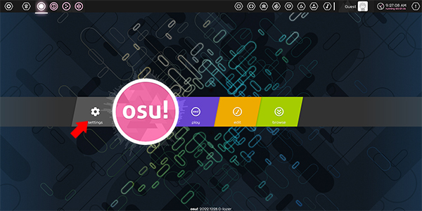1、在本站下载安装并打开osu完成首次打开的基础设置之后即可来到游戏首页,点击OSU!按钮左侧的Settings选项