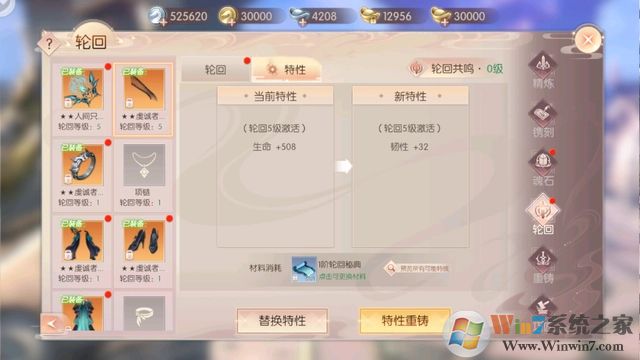 同时,装备还可以获得轮回特性,消耗轮回秘典可以重铸装备获得随机的轮回特性属性,进一步增强装备!