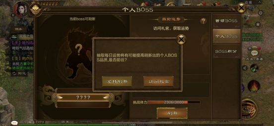 打开“BOSS”界面“个人boss”页签,点击刷新个人boss;如果您未抽取今日运势,将会引导你先抽取今日运势再刷新boss,好的运势对刷新boss颜色有加成作用;