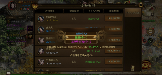 家族有打个人boss的求助时,多主动帮忙打打,这样在你需要的时候,家族的朋友也会伸出援手的。帮助他人不仅能收获友情爱情,还可以获得侠义值!