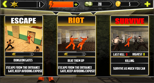 1、下载安装好越狱模拟手机版,进入游戏有三种模式可以选择,逃脱、暴乱和生存。