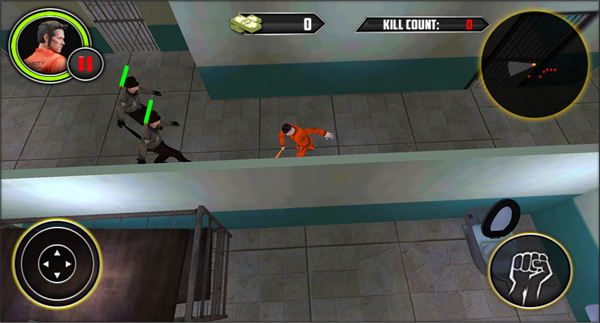 3、使用左边的轮盘控制人物移动右边是攻击按钮,遇到狱警,拿起手中的武器进行攻击。