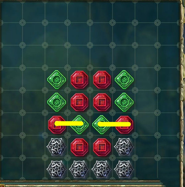 这是靠眼力的游戏,把上图的橙色宝石和绿色宝石交换,即可消除一大片哟~