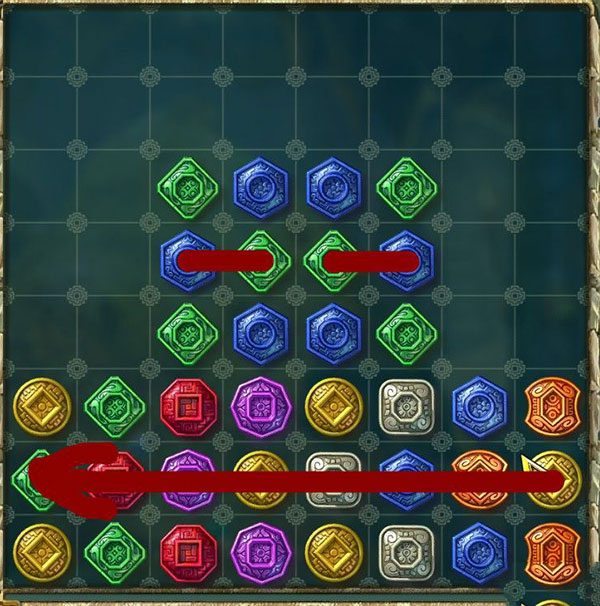 中间两个绿色宝石分别和两边的蓝色宝石互换,下方箭头指示的地方,最右边的黄色宝石向左边一直移动即可消除。