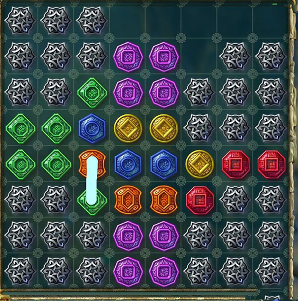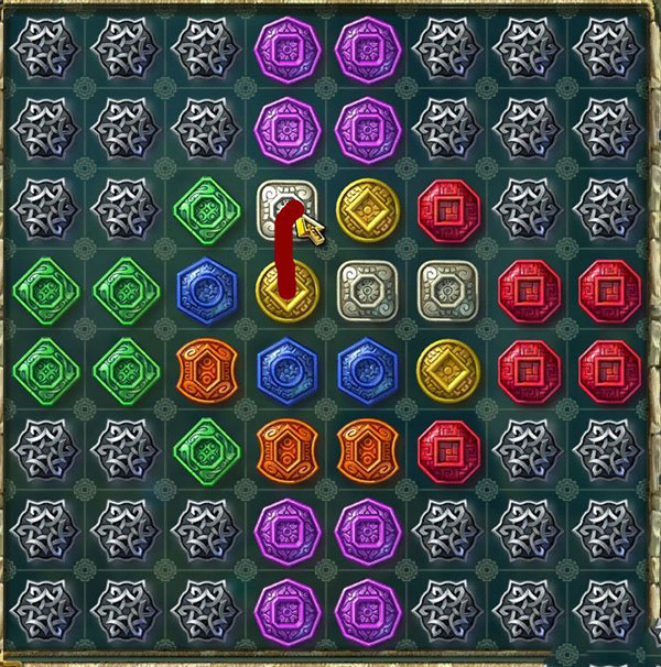 首先把中间部分银色宝石和黄色宝石互换位置就可以消除了……其它几个也是同样方法来消除。