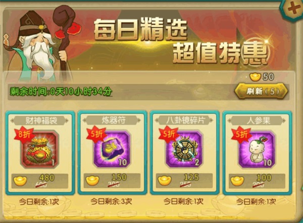 兑换完毕后,可以继续花费元宝来刷新商品,第一次10元宝,以后每次递增1元宝,刷新后可以继续兑换一次。