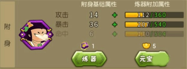 炼器符:法宝2星后娃娃附身可使用,随机增加1点法宝经验或者2-3点不等的附身加成属性(需激活法宝星级)。随着法宝器灵的开启,使用炼器符炼器进度满或者炼器中途可以几率召唤器灵,它的作用也越来越大,