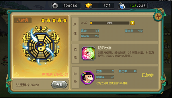 八卦镜为二娃专属法宝,可以提升自身属性外还有特殊技能增加自身能量和降低敌方能量