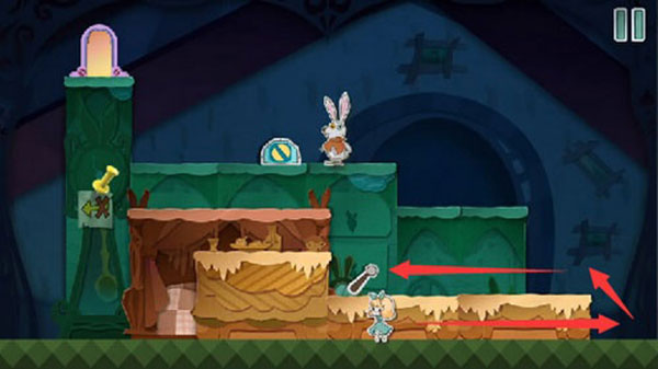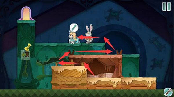 5、按照教学,将红色方块向左拖动,将兔子拼起来触发对话。